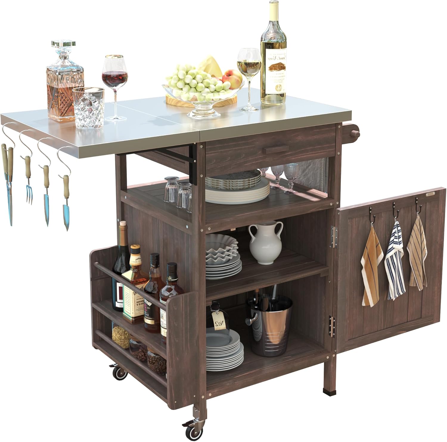 This 40.5-inch Solid Wood Grill Cart with Stainless Steel Top brings natural charm and modern functionality to your outdoor space. Crafted from premium fir wood, it works as a grill cart, outdoor bar cart, or kitchen island with wheels—perfect for lawns, patios, and gardens.Key FeaturesSolid Fir Wood Frame & Stainless Steel Top – Made from 100% premium fir wood with a 30mm thick 201 stainless steel top. Holds up to 230lbs on the tabletop and 110lbs on the shelf. Built to withstand outdoor elements.Drop Leaf Design – Stainless steel drop leaf unfolds for extra workspace, folds down for easy storage. Includes 4 S-hooks for hanging tools.Smart Storage – Large drawer for smaller items, cabinet below with removable center shelf—remove to fit a standard 20lb propane tank. Side spice rack and towel rack keep essentials organized.Thoughtful Details – 4 S-hooks on drop leaf, 3 hooks inside door, trash rack for bags, and built-in bottle opener.Smooth Mobility – Rolls on two 360° lockable wheels with solid wood feet for stability. Easy to move around patio, lawn, or garden.Easy Assembly – Clear instructions and labeled parts – set up in 30-40 minutes.Dimension MeasurementOverall: 40.5" L x 21" W x 36.25" HProduct Weight: 39.7 lbsPackage: 41.5" x 24.75" x 7.75" / 45.1 lbsWeight CapacityStainless Steel Top: 230 lbsShelf: 110 lbsDrop Leaf: 44 lbsDrawer: 22 lbsMaterials: Solid Fir Wood Frame, 201 Stainless Steel TopAssembly Time: 30–40 minutesIncludes: Cart, Hardware, Assembly Instructions